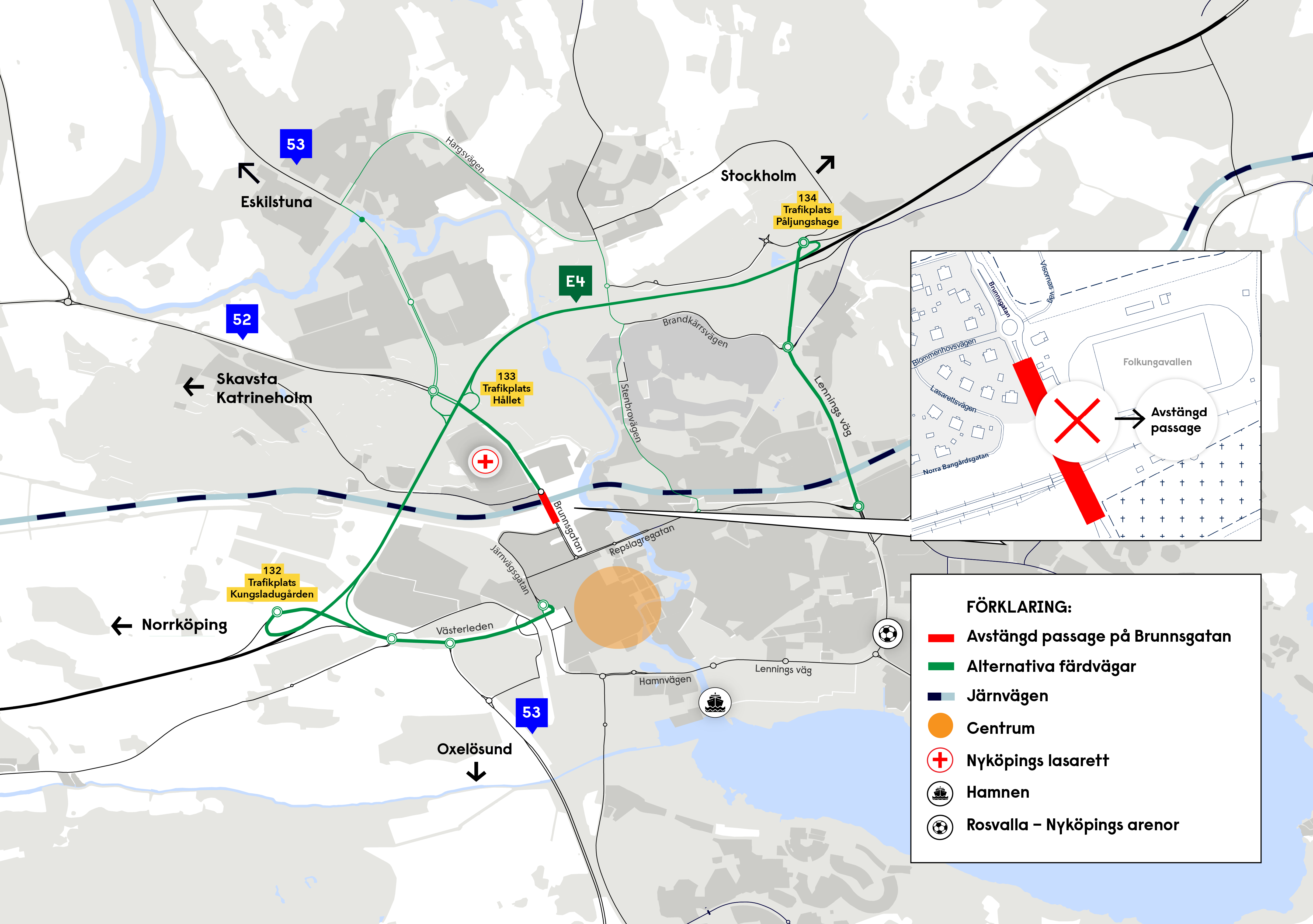På grund av byggnationen av Nyköpings Resecentrum behöver del av Brunnsgatan stängas av under veckorna 7-9. Avstängningen görs för att kunna transportera in den nya järnvägsbron över Brunnsgatan.