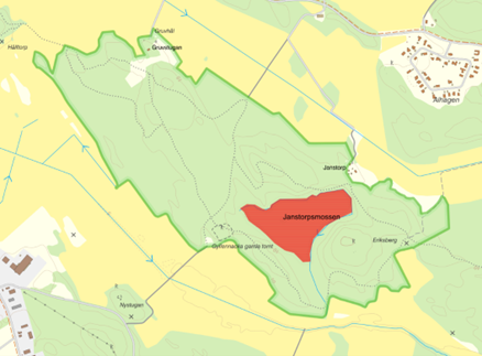 Karta över Janstorpsskogens naturreservat. Det rödmarkerade området visar Janstorpsmossen och den yta som berörs av avverkningen.