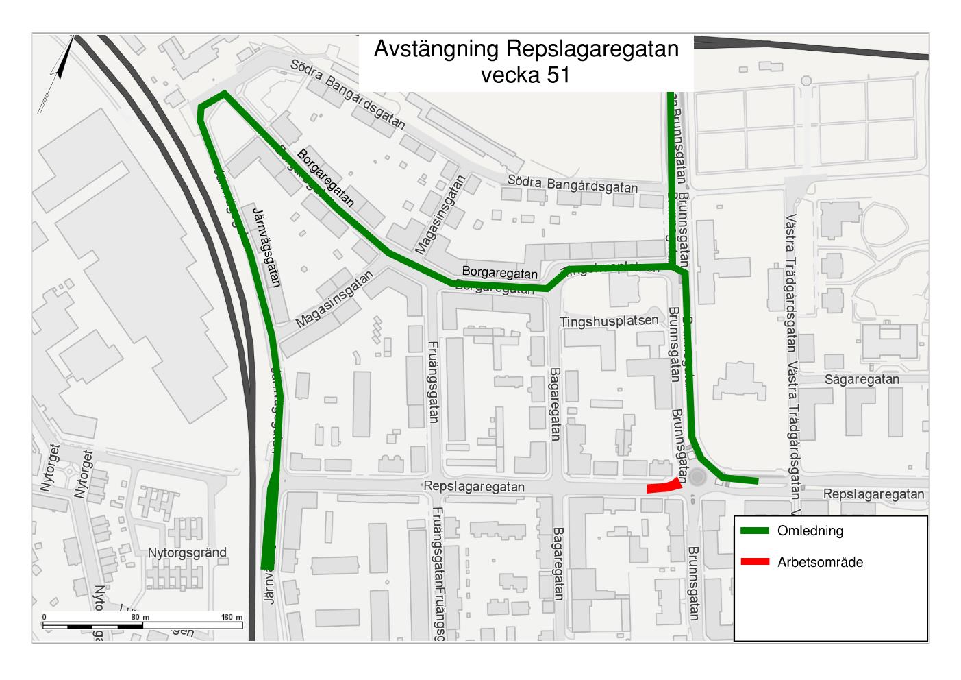 I samband med ombyggnationen av korsningen Repslagaregatan/Brunnsgatan behöver Repslagaregatan mellan Brunnsgatan och Bagaregatan stängas av för fordonstrafik(Buss i linjetrafik och utryckninsgfordon kan passera) under perioden 2025-12-15 06:00 - 2025-12-19 18:00.