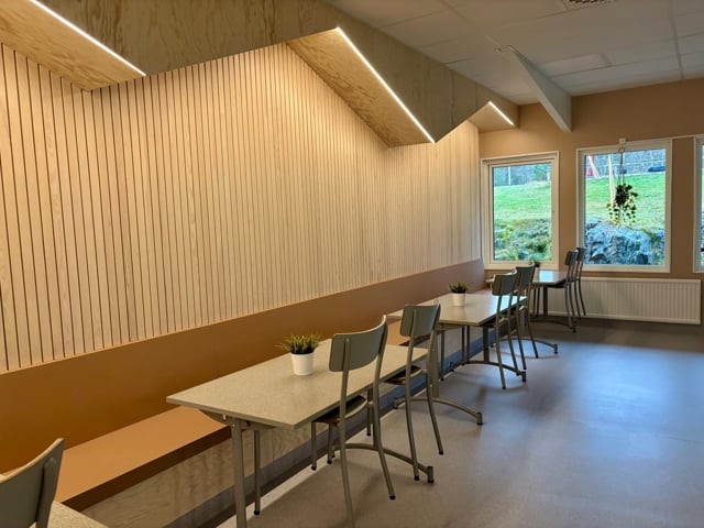 • Nytt ljuddämpande innertak och akustikpaneler i matsalen