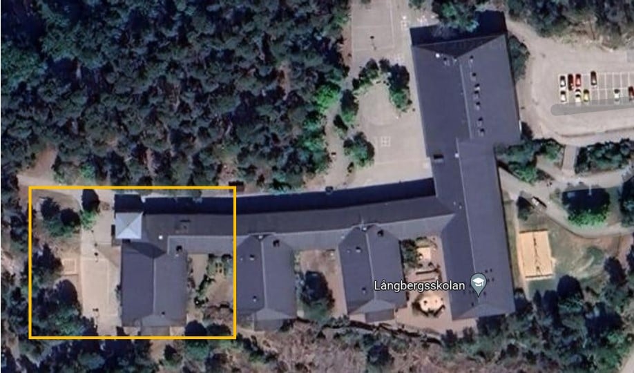 Flygfoto, gulmarkerat är byggnaden för anpassad skola på Långberg