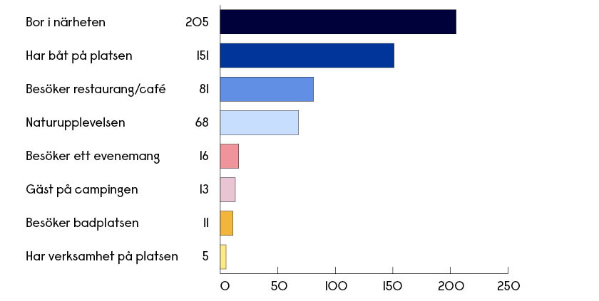 De främsta anledningarna till att människor vistas i området är att de bor i närheten, är engagerade i båtliv eller besöker någon av hamnens utbud av restaurang/foodtrucks. Även naturupplevelser är en viktig faktor som lockar många.