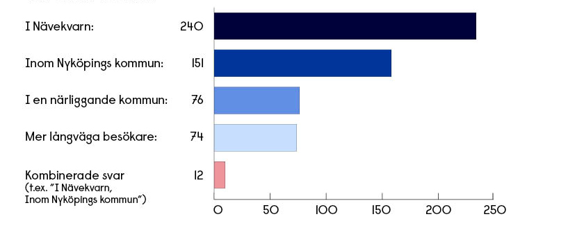 En majoritet bor i Nävekvarn eller inom Nyköpings kommun. Undersökningen fångar alltså främst lokalbefolkning, men även en del långväga besökare.
