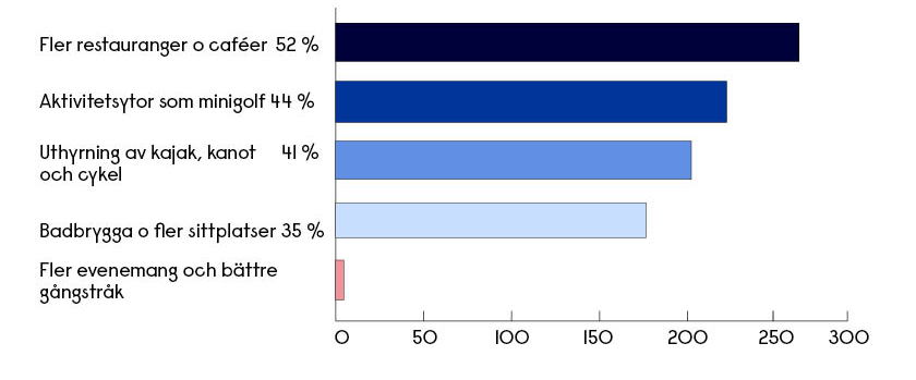 Stark efterfrågan på levande mötesplatser och evenemang. Det finns en stark önskan om mer utbud och aktiviteter: särskilt fler restauranger/caféer, uthyrning och aktivitetsytor. Även förbättrad infrastruktur (sittplatser, badbrygga, bättre gångstråk) efterfrågas.