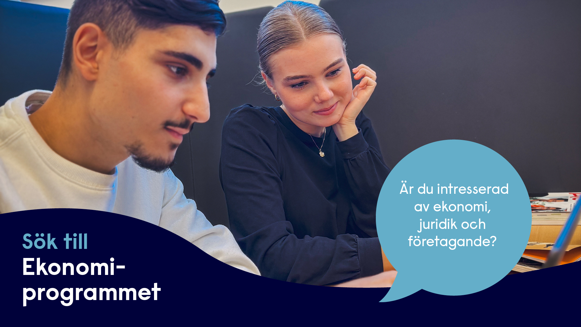 Vill du förstå hur företag funkar, hur man startar eget eller hur lagen påverkar vår vardag? På ekonomiprogrammet får du testa allt från att driva eget företag med Ung Företagsamhet till att lära dig vad som gäller i ett demokratiskt samhälle – både i Sverige och internationellt.