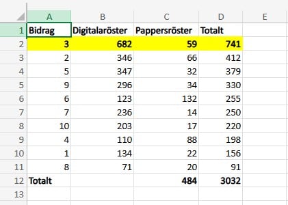 Det kom totalt in 3032 röster på bidragen, och de flesta röstade digitalt. 484 röster kom in på pappersröstsedel i Stadshuset där alla finalisterna fanns att se i en utställning. Vinnare var Fokusskolans klass 5 med bidrag nr 3.
